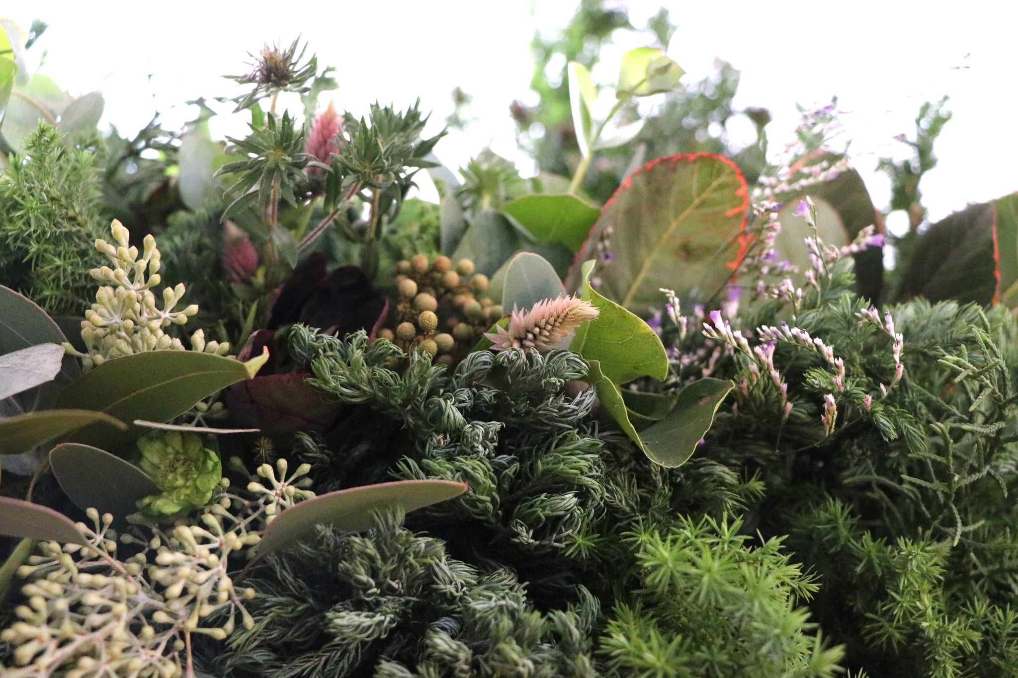 Eternal Forestでは、モミ、ヒムロスギ、ヒバ、ブルーアイス、ユーカリなど、森林を思わせる植物を中心に、季節の草花を十数種類使用しています。